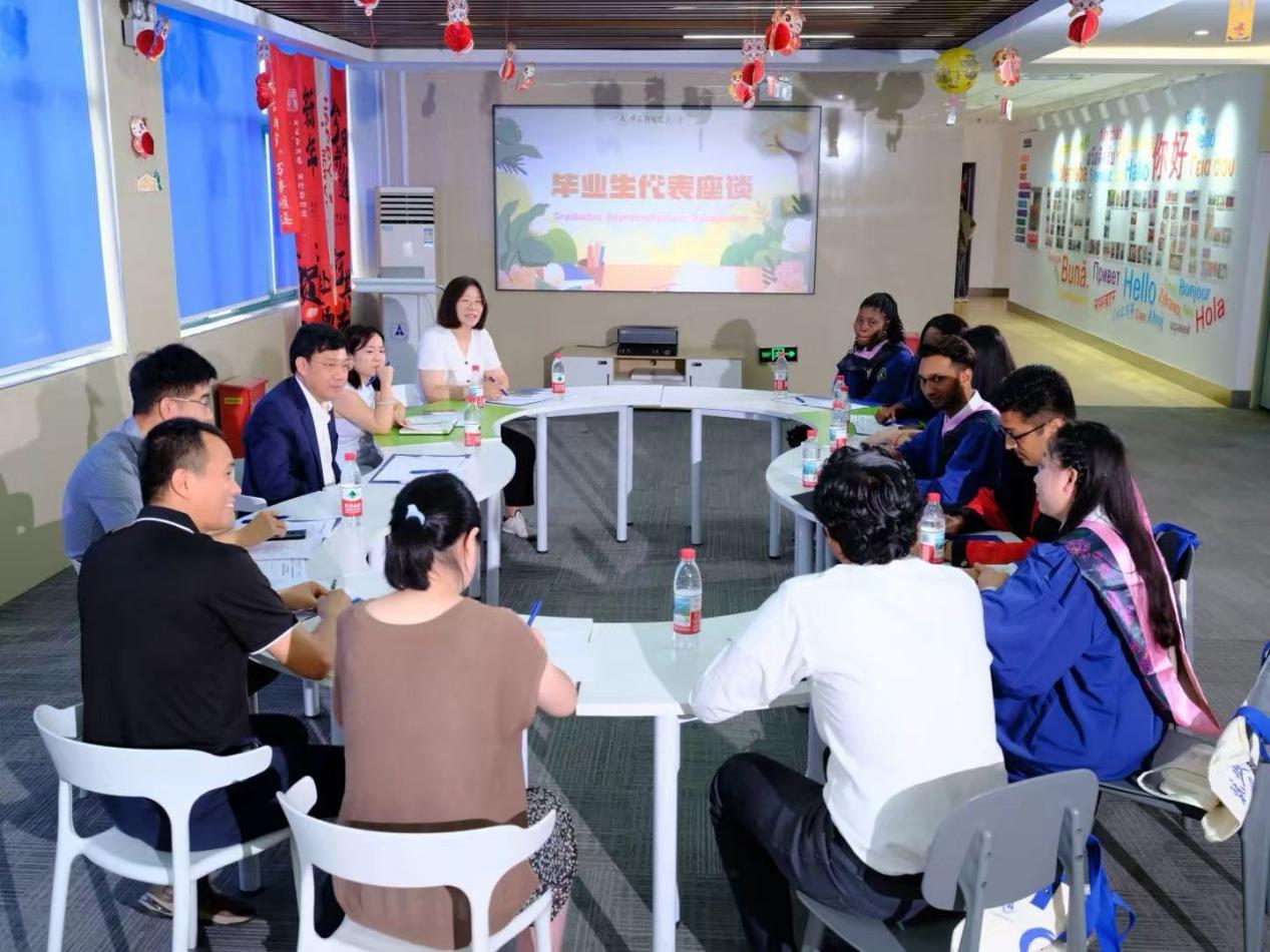 座谈会上,刘仁山副校长与国际毕业生代表亲切交流,询问学习生活体验,征求对学校发展建议。毕业生代表感谢学校栽培,分享学习收获,建议学校相关系统使用中英双语,并希望毕业典礼有国际学生发言致谢。