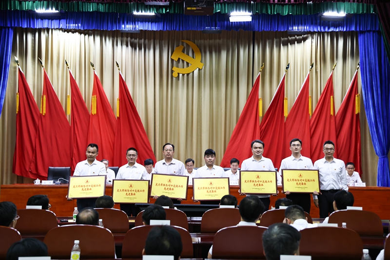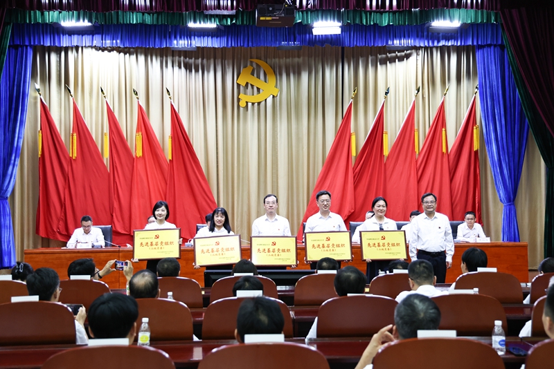 校党委副书记、纪委书记申祖武和校党委副书记陈狮向荣获“先进基层党组织”称号的党支部代表颁发奖牌