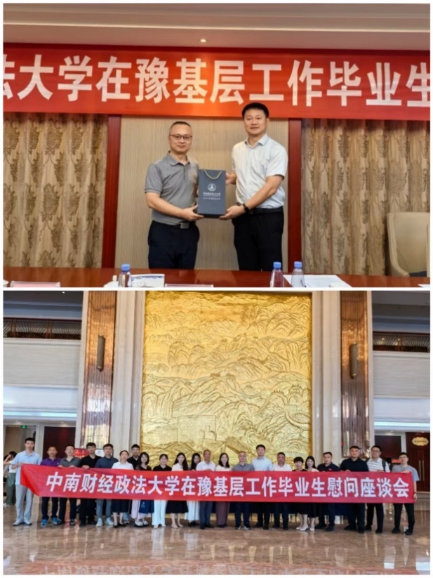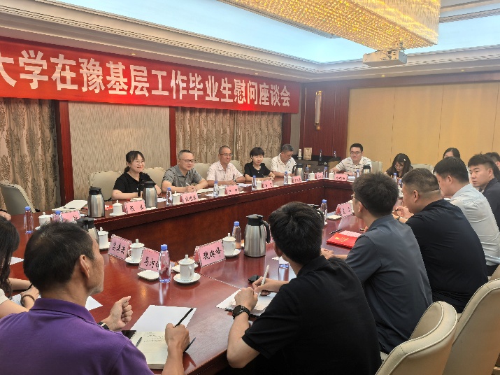 7月6日下午,在豫基层工作毕业生慰问座谈会在郑州市紫荆山融通宾馆举行。河南校友会秘书长傅小钟,来自郑州市、宝丰县等地的基层工作校友17人参加了座谈。傅小钟代表河南校友会对陈狮副书记一行的到来表示热烈的欢迎,介绍了当前河南校友会的工作和发展规划。中原大学发源地宝丰县委常委、肖旗乡党委书记、河南省选调生、我校2014届博士毕业生夏上校友介绍了在乡村振兴一线的工作情况和中原大学纪念馆的建设历程。校友们汇报了自身在财政、金融、司法、乡村振兴等领域的工作经验和成绩,讲述了在母校学习阶段专业知识、学生干部锻炼经历、实习实践等方面对工作开展的关键作用,也提出了对母校发展的美好祝愿和意见建议。就业指导服务中心主任温习表示将持续搭建合作平台,为基工作者提供政策咨询、资源对接等支持。