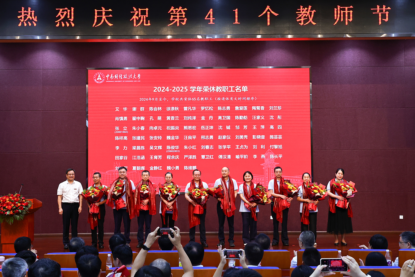 学生代表为光荣从教40年教师献花,朱方伟为光荣从教40年教师赠送纪念奖杯。