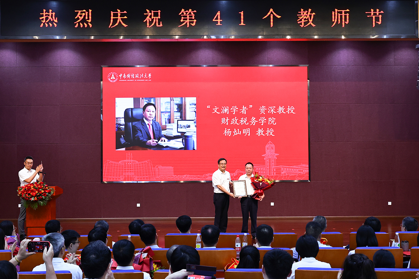 侯振发为“文澜学者”资深教授财政税务学院杨灿明教授颁发证书。