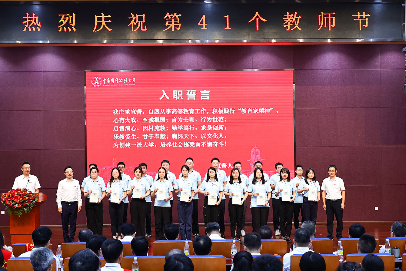 金融学院董志华教授带领新入职教职工代表宣誓。校党委常委、副校长陈柏峰与董志华教授为新入职教职工代表赠送校史。校党委常委、副校长刘仁山为“初任教师导师制”导师代表颁发聘书。