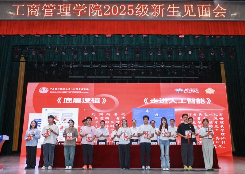 在一年一度“书香工商 梦想起航”赠书环节,吴海涛院长和余小朋书记分别为新生代表赠送精心挑选的书目《底层逻辑》和《走进人工智能》。