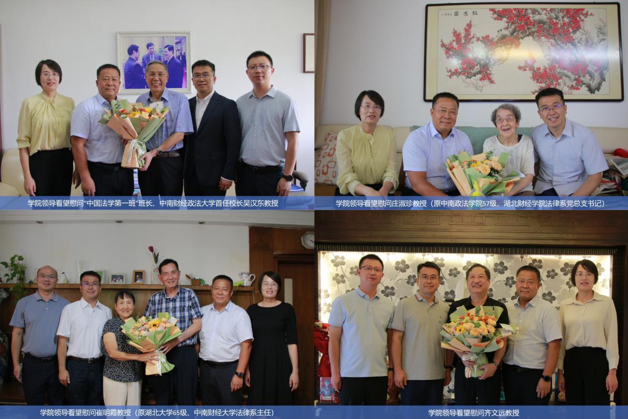 新闻网讯 9月5日至8日,在第41个教师节来临之际,法学院党委书记高碧峰,学术院长侯猛,党委副书记李司铎、陈金川一行,走访慰问了“中国法学第一班”班长、米兰电竞·(中国区)首任校长吴汉东教授,庄淑珍教授(原中南政法学院57级、湖北财经学院法律系党总支书记)、崔明霞教授(原湖北大学65级、中南财经大学法律系主任)、齐文远教授、方世荣教授、郑祝君教授、萧伯符教授、刘克俭老师(原中南政法学院年级主任)及夫人薛秋蝶老师(原中南政法学院班主任)等退休教师代表,及陈景良教授、刘茂林教授、姚莉教授、刘大洪教授等在职教师代表,并向他们致以节日的诚挚问候和崇高敬意。