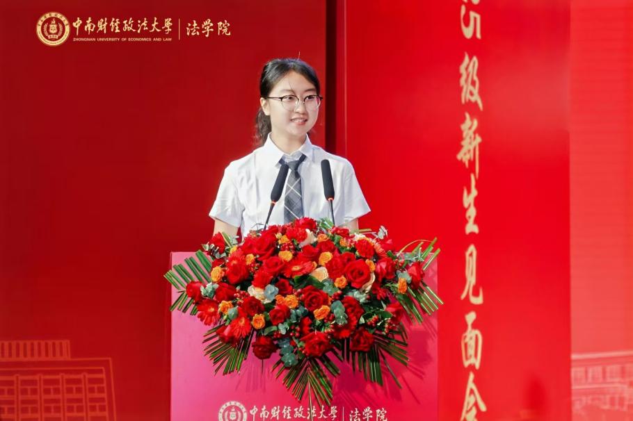 法2504班本科生吕星瑶作为新生代表发言,分享母亲作为公益律师的感人事迹,誓言“以信念为舟、法律为桨、奋斗为帆,不负法治所向”。