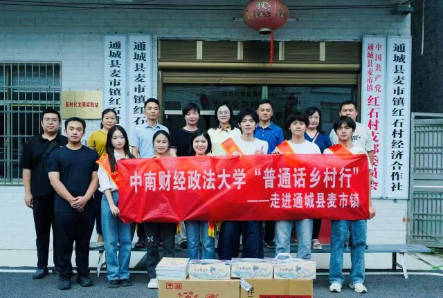 随后,团队赴红石村开展调研座谈,张贴推普周宣传海报,并向村委捐赠儿童绘本和笔墨纸砚等文具。