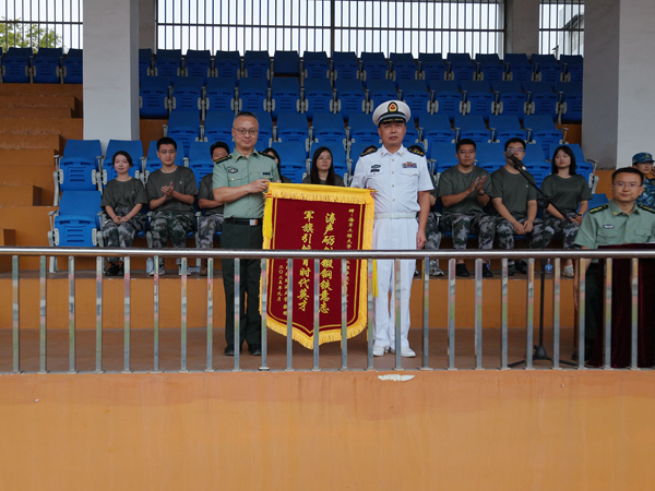 黄小妹宣读《关于表彰2025级学生军训先进集体及优秀个人的决定》。全体领导分别为军训先进集体和优秀个人代表授予锦旗,各学院带队老师代表上台领奖。
