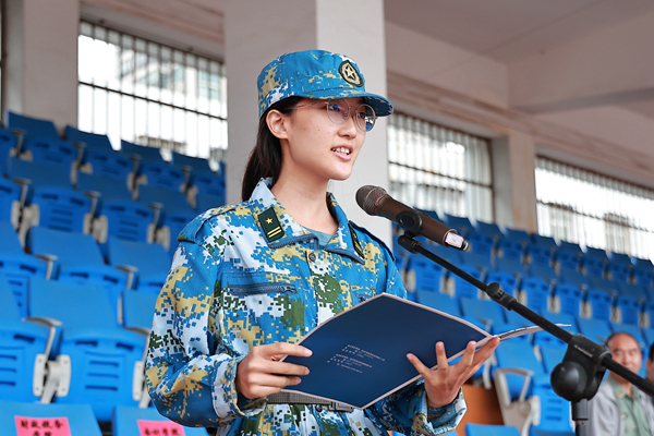 文澜学院姜苏珍、外国语学院李斓代表2025级全体参训学生发言,分享军训淬炼下的感悟和蜕变,号召同学们用行动诠释青春担当。