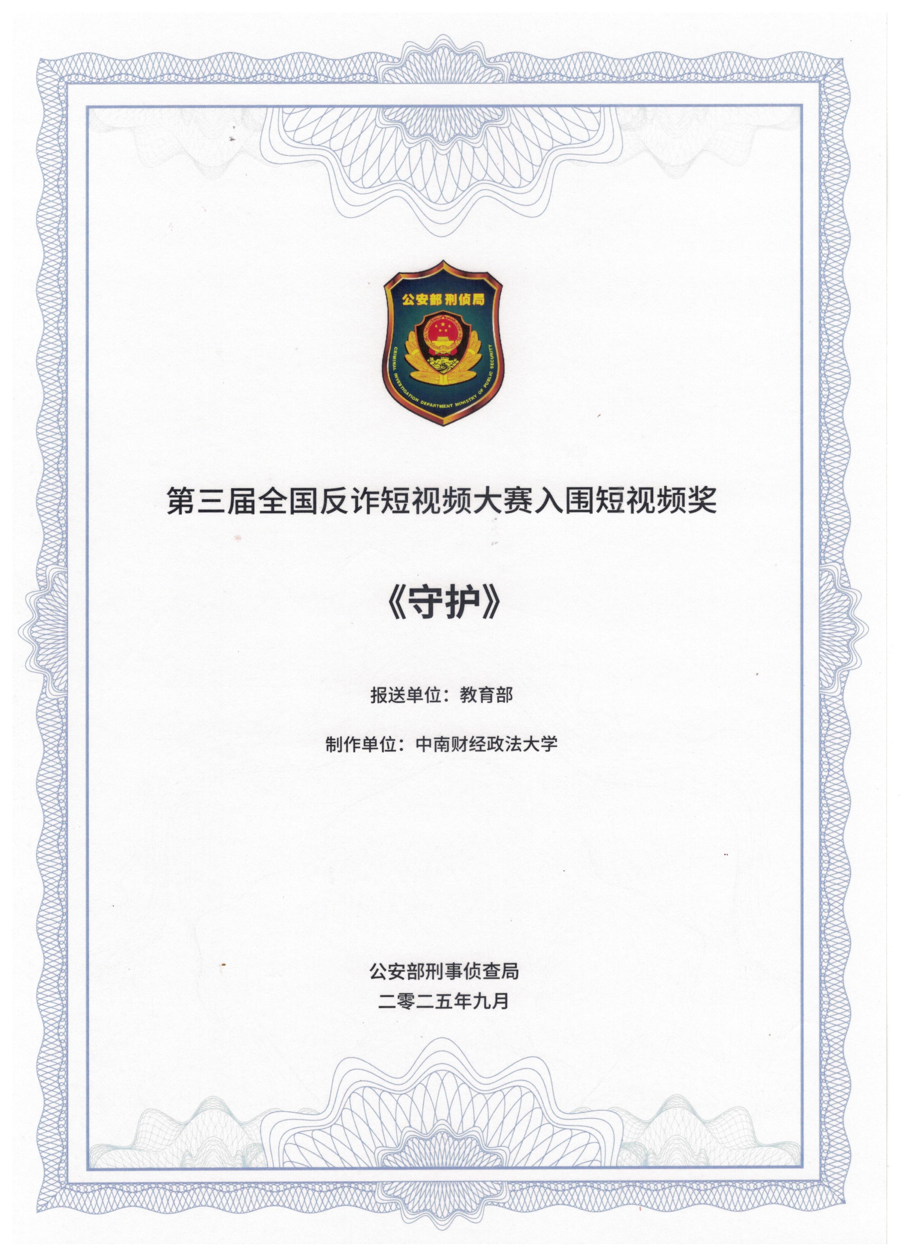 新闻网讯(通讯员 石权)近日,第三届全国反诈短视频大赛获奖名单正式揭晓,我校反诈短视频作品《守护》代表教育部参赛,荣获“入围短视频奖”。