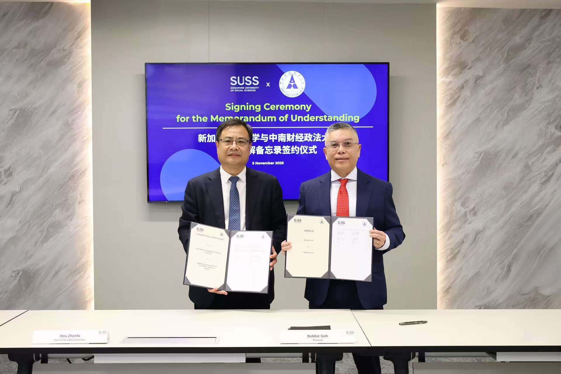 访问新加坡社科大学期间,侯振发与常务副校长Robbie Goh教授共同签署合作备忘录。两校将在学术研究、课程共建、师生互访等领域展开全面合作,并积极推动共建“AI+社科”交叉学科联合研究平台,实现数字技术与经管法学科的深度融合。