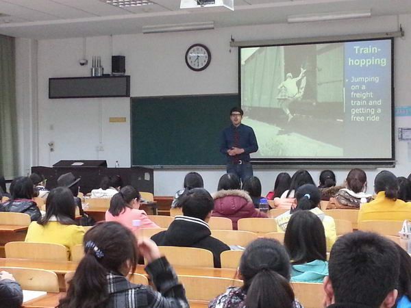 2014年3月13日18:40,由外国语学院主办的“西方文化系列讲座”如约在文波楼111教室开讲。我院外籍教师Andrew Olivi 以“Travelling”为主题给近百名同学做了一次图文并茂、生动活泼的讲座。