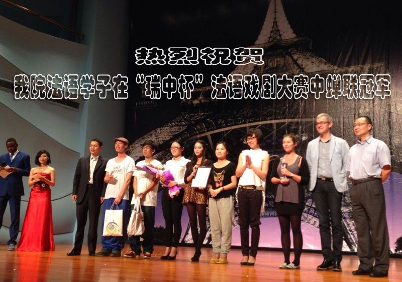 能在与武汉各大高校法语系的激烈竞争中再夺桂冠,绝非偶然。这是我校法语专业第三次参加法语戏剧节比赛,经过前两次的历练,师生们深知精心准备的重要性。自着手准备到成功演绎前后接近半年的时间。在此期间,法语专业的夏正华老师作为此次中南财大代表队的领队,与外教Sabine携手,承担了从剧目选择,排练指导,后勤服务,领队出征的全部工作。五位演员中有三人来自二年级,在紧张备考专业四级考试的同时,仍然拿出大量时间排练,从琢磨发音,到纠正姿态,一步步做到收放自如。另外两名三年级学生都是学院活动骨干,王文卓不仅专业成绩突出,还积极参与校外多项法语和英语竞赛,语言技能全面;更特别的是张同响,已连续两届参演法语戏剧,表演爆发力强,给多位评委留下深刻印象,在各高校法语专业中已小有名气。比赛期间,我校还有数十名法语专业学生被选为戏剧节志愿者,她们或参加礼宾队,或进入道具组,或成为联络员,甘当绿叶,以饱满的热情发挥着自己的光热。当然,外语学院谢群院长和其他院领导,以及学院行政班子也给予了不可忽视的精神和物质支持,法语教研室主任王璇老师和各位同仁也是一如既往地给予关注和寄予厚望。