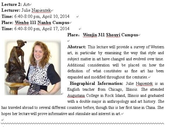 | 2. | Art | Julie | 2014年4月10日,18:40—20:00 | 南湖:文波111 |