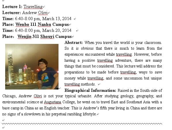 | 1. | Travelling | Andrew Olivi | 2014年3月13日,18:40—20:00 | 南湖:文波111 |