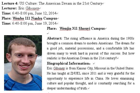 | 4. | US Culture: The American Dream in the 21st Century | Eric Giboney | 2014年6月12日,18:40—20:00 | 南湖:文波111 |