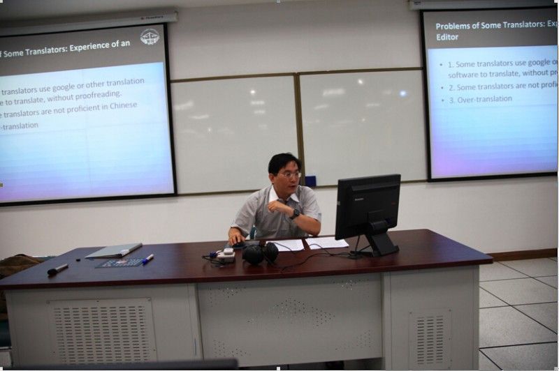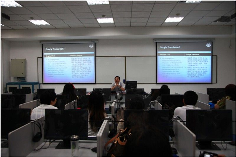 6月6日上午8时,此次翻译学术讲座在文波117教室拉开帷幕。讲座嘉宾是李为尧博士,现任教于台湾实践大学,主要学术研究领域为英国浪漫主义、新历史主义和符号学等相关领域,讲授课程包括英文阅读、文法与修辞、论文写作、莎士比亚、英诗选读等课程。李老师以“The Task of a Translator: A Cross-Cultural Perspective”为题,从跨文化交际的角度,陈述了做为一名译者必备几项基本素质,即有一定的语言素养,掌握相关文化背景,如实反映文本,不能过度翻译等等,接着列举了几位著名的翻译巨匠及其主要观点并作出简要评价,讲座内容详实,观点鲜明,富有创意,为在座的老师和同学提供了一场生动,新颖,别具一格的翻译讲座,讲座结束后老师和学生踊跃提问,现场气氛活跃。