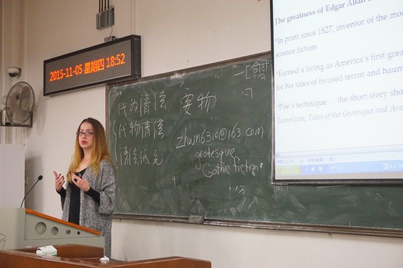 (通讯员龙豫报道)2015年11月5日晚,由外国语学院主办的“第二期西方文化大讲堂:外教系列讲座(四)“Horror in Literature: Twisted Tales by Edgar Allen Poe?”在南湖校区文澜楼107教室如约开讲。此次讲座主讲人为我院外籍教师Melissa Harding。讲座吸引了全校各个学院热爱英语学习、对英语文学感兴趣的同学们。