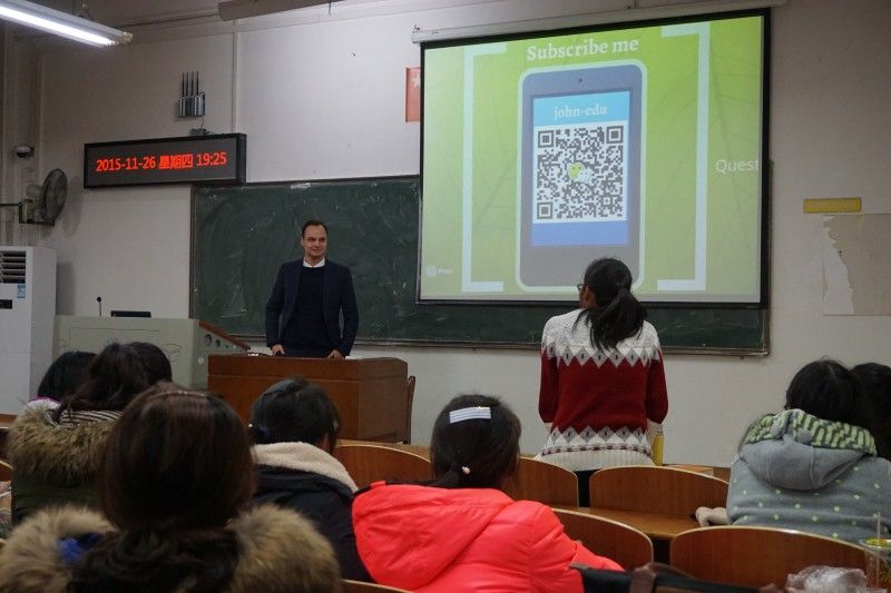 (通讯员龙豫报道)2015年11月26号晚,由外国语学院主办的“第二期西方文化大讲堂:外教系列讲座(一)How well do you know about the Westerners?”在南湖校区文澜楼107教室如期开讲。主讲人为我院外籍教师John Saari。讲座吸引了全校各个学院热爱英语学习的同学们。