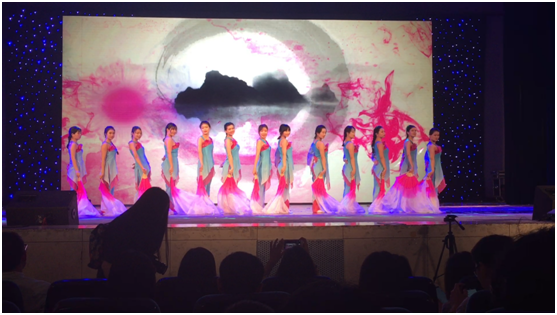 在经过近一个月的排练后,这场由我院13名学生共同演绎的扇子舞终于登场了。他们伴随着美妙的音乐,手持折扇,翩翩起舞,节奏时而轻缓时而明快。婀娜的身姿背后印衬的是秀丽的江南水乡,他们好似一群从水墨画里走出的佳丽,温婉而淡雅。
