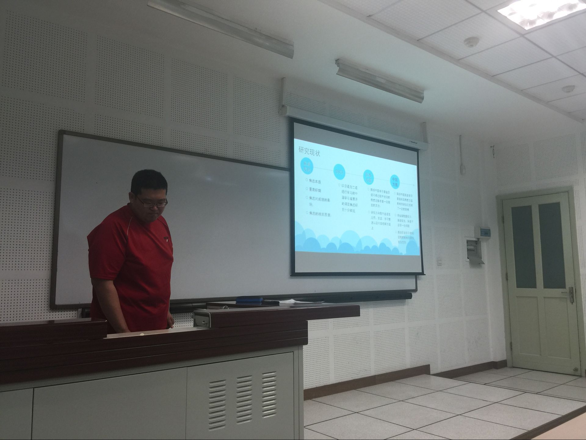 华科研究生李明昊同学做了题为“211高效日语专业学生在日语阅读上的焦虑研究调查—兼与中、美、日三国外语学习者对比”的个人研究汇报。该研究在先行研究的基础之上,从多个方面做了进一步的研究调查,并且运用统计学知识对数据进行了分析,得出了一些很有价值的结果。