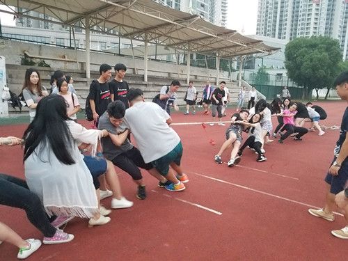 最后一个版块是最激烈的拔河比赛。参赛者们摩拳擦掌,积极商量战术,拉拉队奋力加油,打气助威;体育场上沸腾一片。最后商英1501、1503和法语1401分别获得本年级冠军。