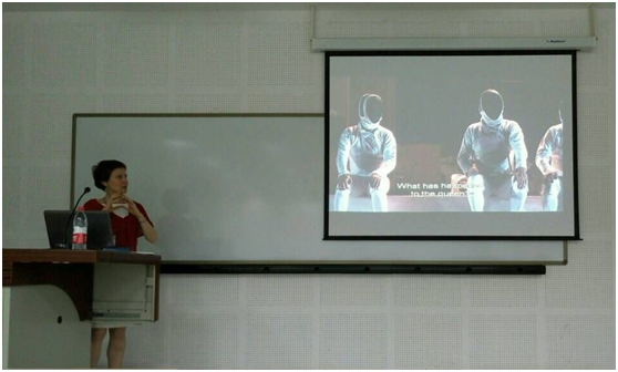 讲座伊始,谢群教授首先对斯特凡诺娃博士的到来表示热烈的欢迎,然后简要地介绍了斯特凡诺娃教授的研究方向及研究成果。接着,卡丽娜•斯特凡诺娃教授以《哈姆雷特》第一幕第五景中哈姆雷特所言“The time is out of joint”(“这是一个颠倒混乱的世界”)为切入点分析了19和20世纪东欧戏剧中的政治戏剧的发展趋势及其关注点---如何改变我们所处的这个物欲横流的世界。斯特凡诺娃教授还介绍了波兰作家Ian Kott所写著作Shakespeare---Our Contemporary以及四位杰出的东欧导演---Eimuntas Nekrosius、Oskaras Korsunovas、Ian Klata和Daniel Spinar,并就他们以哈姆雷特为蓝本所创作的四部“政治与灵魂相互交融”类戏剧从不同的舞台表现手法、呈现方式进行了具体的分析与欣赏,为我们更好地理解哈姆雷特提供了新的思路和想法。