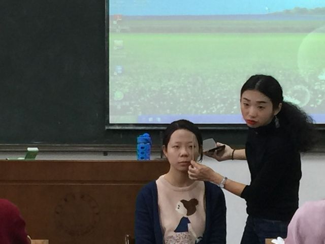 刘赢和老师曾多次为我院大型晚会演员化妆,技巧熟练经验丰富,尤其对大学生职业美妆有自己独到的见解。此次刘老师现场为同学们讲解职业美妆知识,吸引了大批对美妆感兴趣的同学前来参加。刘老师首先为大家讲解了基本的美妆常识,接着又亲自示范,以两位现场同学为模特,依次为大家详细演示了上底妆、画眉毛、描眼线、画眼影、遮瑕修颜等适用于现代职场的化妆技巧。生动的展示和细致的讲解吸引了在场所有同学的目光,令大家对美妆这门虽繁琐却又实用的学问产生了浓厚的兴趣。讲解过后,刘老师又耐心回答了同学们提出的问题,并与大家交流了自己在化妆方面的经验,大家纷纷表示受益匪浅,既学到了知识,又可以在以后的职场面试中加以运用,为自己的形象加分。