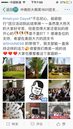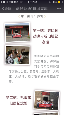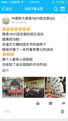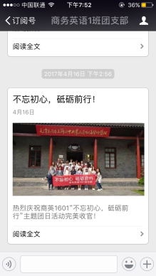 4月15日和4月16日,商英1601团支部分别在官方微信、官方微博以及官方QQ上做出了有关本次团日活动的报告,祝贺团日活动圆满成功。
