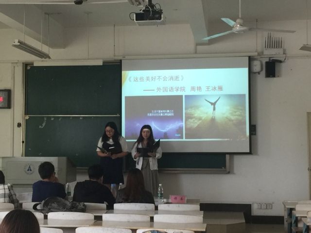 本次大会“为你读诗”的一共有十五位选手,选手们所朗诵的诗歌主题众多,包括青春、爱情、亲情、家国情等众多主题。选手们的朗诵或声情并茂或款款情深,配合着悠扬婉转的背景音乐,把听众带入了如梦似幻的诗词之境。代表我院参加的同学有潘芸熙,夏晓璐,周艳和王冰雁。