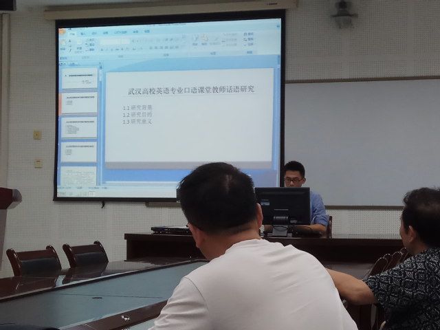 徐伟红同学以《武汉高校英语专业口语课堂教师话语研究》为题,展示了其研究背景、研究目的和研究意义。研究问题分别为“武汉高校口语课堂教师话语的特点是什么?”,“有哪些特点可以促进学生的语言习得?”。汇报完毕后,阮教授指出,其题目中没有体现出研究目的,研究范围太广,还需要进行细化,缩小研究范围。李教授也对这一问题表示赞同,认为硕士论文不需要太多理论,用具体的理论作为其研究基础即可。
