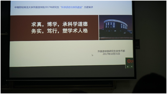(通讯员 周国锋)2017年10月31日19:30,我校外国语学院研究生科学道德与学风建设宣讲报告会在文添楼202教室举行。会议由2017级研究生蔡娇同学主持,外语学院17级全体研究生参加了此次活动。