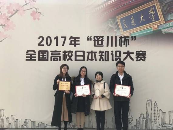 (通讯员 周新平)2017年12月8日至10日外国语学院日语系学生张君惠、陈馨蕾、林宣佑在指导老师周新平的带领下,代表我校参加了在上海交通大学举办的2017“笹川杯”全国高校日本知识大赛,并获得了团体三等奖、陈馨蕾同学获得个人优胜奖、周新平老师获得优秀指导老师奖的佳绩。