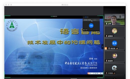 (通讯员盛锦涛)7月17日上午8:30-10:00,外国语学院开展2020年文澜优秀大学生“人文之星”夏令营线上讲座活动。来自全国各地院校的65名夏令营学员准时到场聆听此次讲座。本次线上讲座由外国语学院副院长阮全友教授主持,主讲人为外国语学院副院长、语言信息工程研究所所长、院学术委员会副主任胡惮教授,讲座主题为“语言智能技术发展中的伦理问题”。
