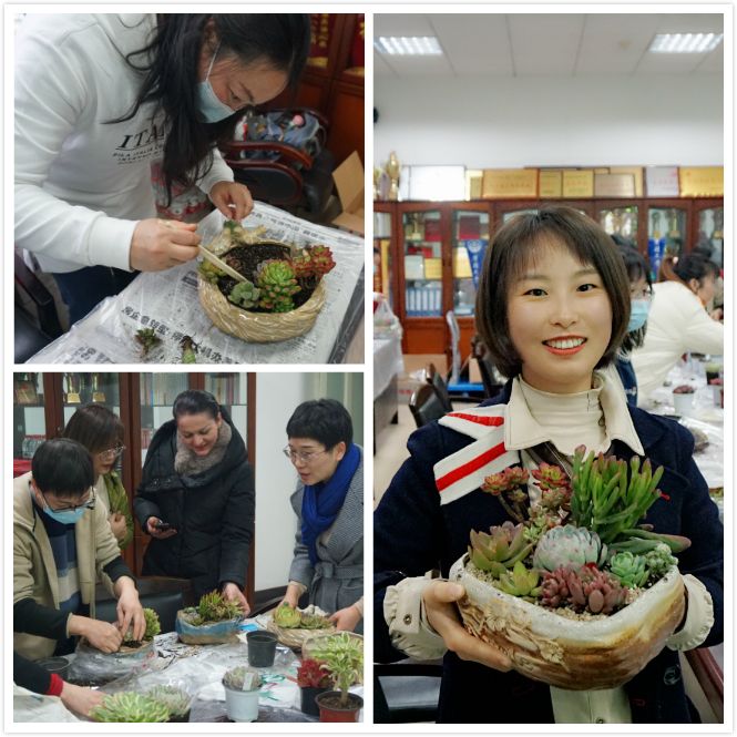 园艺老师首先为大家介绍了多肉植物的品种、栽培、种植条件等各方面知识。在讲解完如何栽培多肉植物后,园艺师带领大家现场制作了一份属于自己的多肉作品。剖土、栽种、铺石、装饰……,教师们纷纷动手尝试,每个人都乐在其中。老师们发挥想象,互帮互助,变身巧手花匠,尽情释放自己的想象力,打造一盆盆各具特色、充满诗意的“纯手工盆景”。老师们边动手边交流多肉的种植和养护经验,更获得了互相了解和增进默契的机会。活动在一片欢声笑语中画上了圆满的句号。