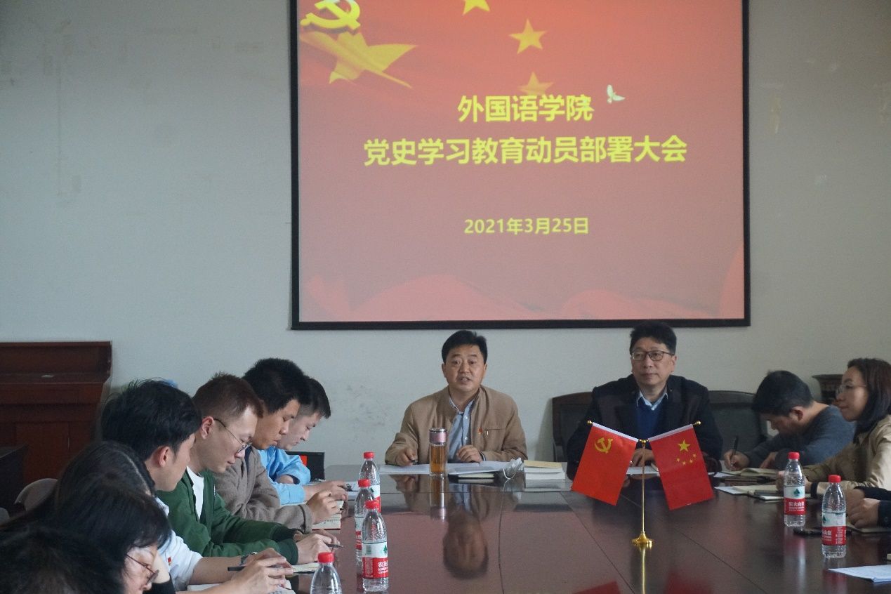院网讯(通讯员 陈长军)根据上级党组织关于党史学习教育相关要求,3月25日下午2:00,学院在文波楼402会议室召开党史学习教育动员部署大会,深入学习贯彻习近平总书记在党史学习教育动员大会上的重要讲话精神,对全院开展党史学习教育进行动员部署。学院党政领导班子全体成员、党委委员、纪委委员、行政教辅人员、教工党支部书记、学生党支部书记、师生代表参加会议。院党委书记余启军作动员部署讲话,院长蔡圣勤主持会议。