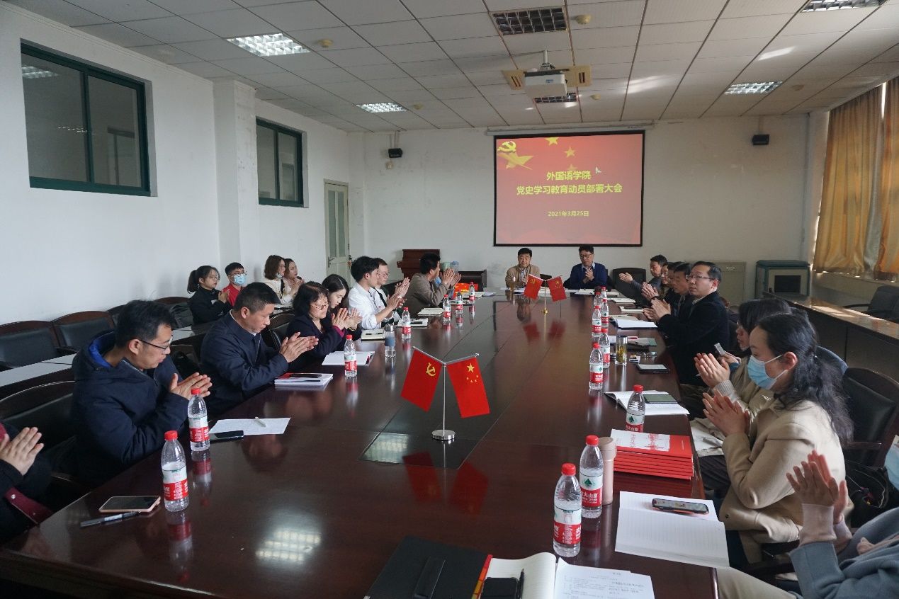 紧接着党委书记余启军同志就开展党史学习教育作动员讲话。余书记强调我们要通过学史明理、学史增信、学史崇德、学史力行,进而统一思想、统一意志、统一行动,从党的百年伟大奋斗历程中汲取智慧力量,在学院教育教学改革的新征程中践行初心使命,努力做到学党史、悟思想、办实事、开新局。同时余书记从重要意义与目标要求、学习内容、进度安排、重点任务、组织领导与工作要求五个方面传达了《外国语学院党委关于开展党史学习教育的工作方案》,并提出三点要求:一要提高政治站位,深刻认识党史学习教育的重大意义。提高运用习近平新时代中国特色社会主义思想指导教育教学工作的水平,提高解决理论和实践种种难题的能力。二要把党史学习教育与党对学院教育事业全面领导相结合、与落实立德树人根本任务相结合、与学院基层党组织建设、与切实为师生办实事解难题相结合,实现党史学习教育与学校、学院事业发展同频共振。三要切实加强党史学习教育的责任落实,强化责任传导,营造浓厚氛围,推动党员立足岗位实际,从教学科研管理、学习生活服务等方面,为师生办实事、为社会办好事。