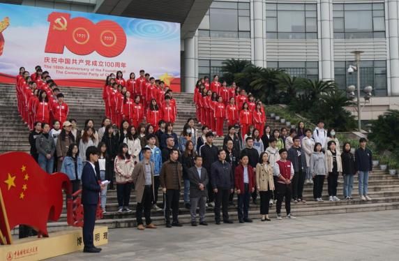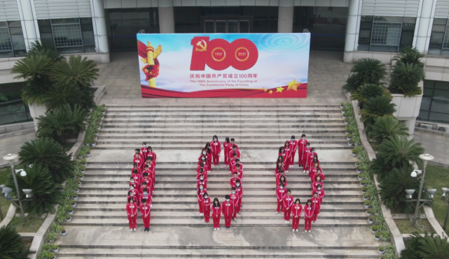 在清晨的朝阳中,全体师生肃立在中原楼前,学生党员代表摆出“100”的字样,共同迎接国旗的到来。