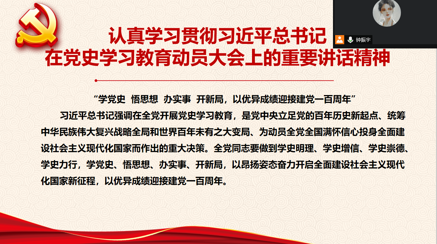 在支部书记的带领下,全体党员同志认真学习习近平总书记在党史学习教育动员大会上的重要讲话,深刻了解领会为什么学党史、如何学党史、怎么学好党史。习近平总书记强调,在全党开展党史学习教育是党中央立足党的百年历史新起点、统筹中华民族伟大复兴战略全局和世界百年未有之大变局、为动员全党全国满怀信心投身全面建设社会主义现代化国家而作出的重大决策。作为即将踏入社会的学生党员,我们要做到学史明理、学史增信、学史崇德、学史力行,学党史、悟思想、办实事、开新局,以昂扬姿态奋力开启全面建设社会主义现代化国家新征程,以优异成绩迎接中国共产党建党一百周年。