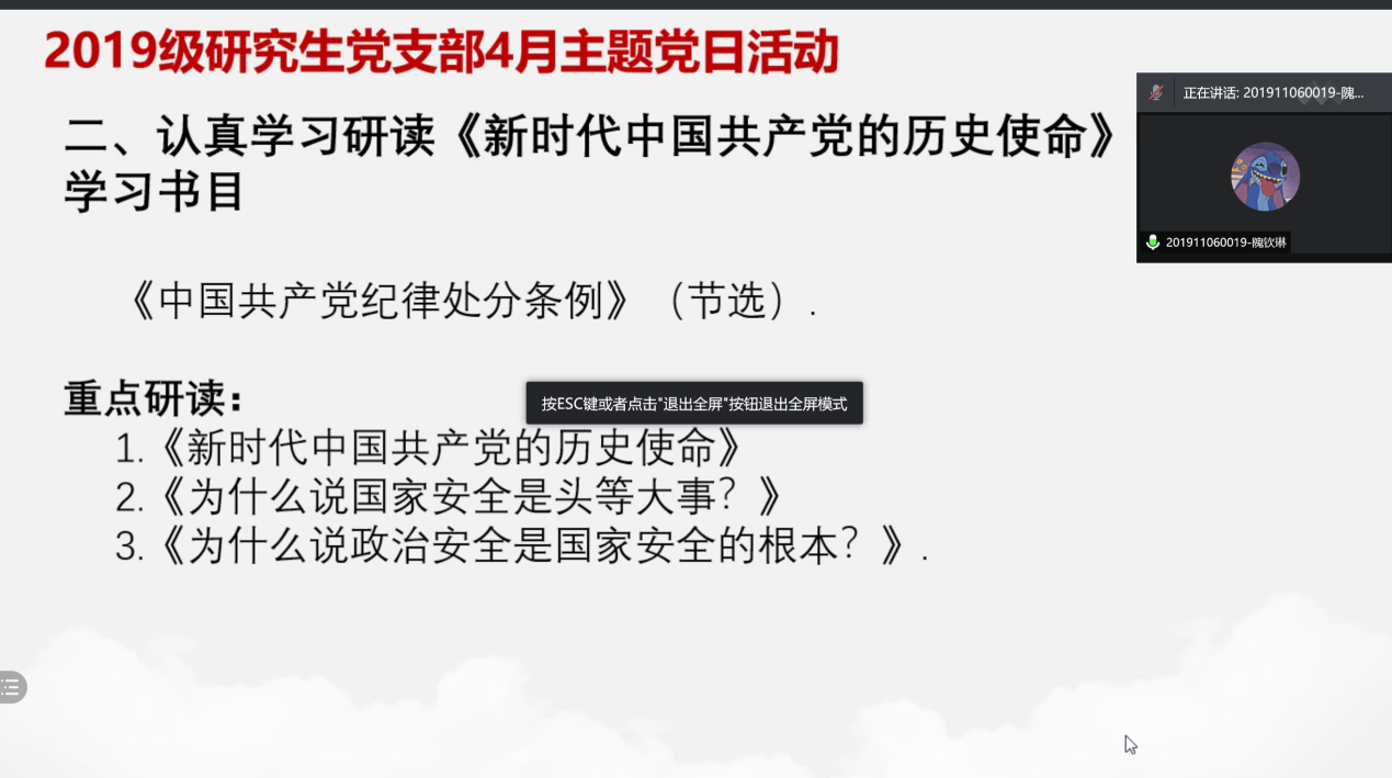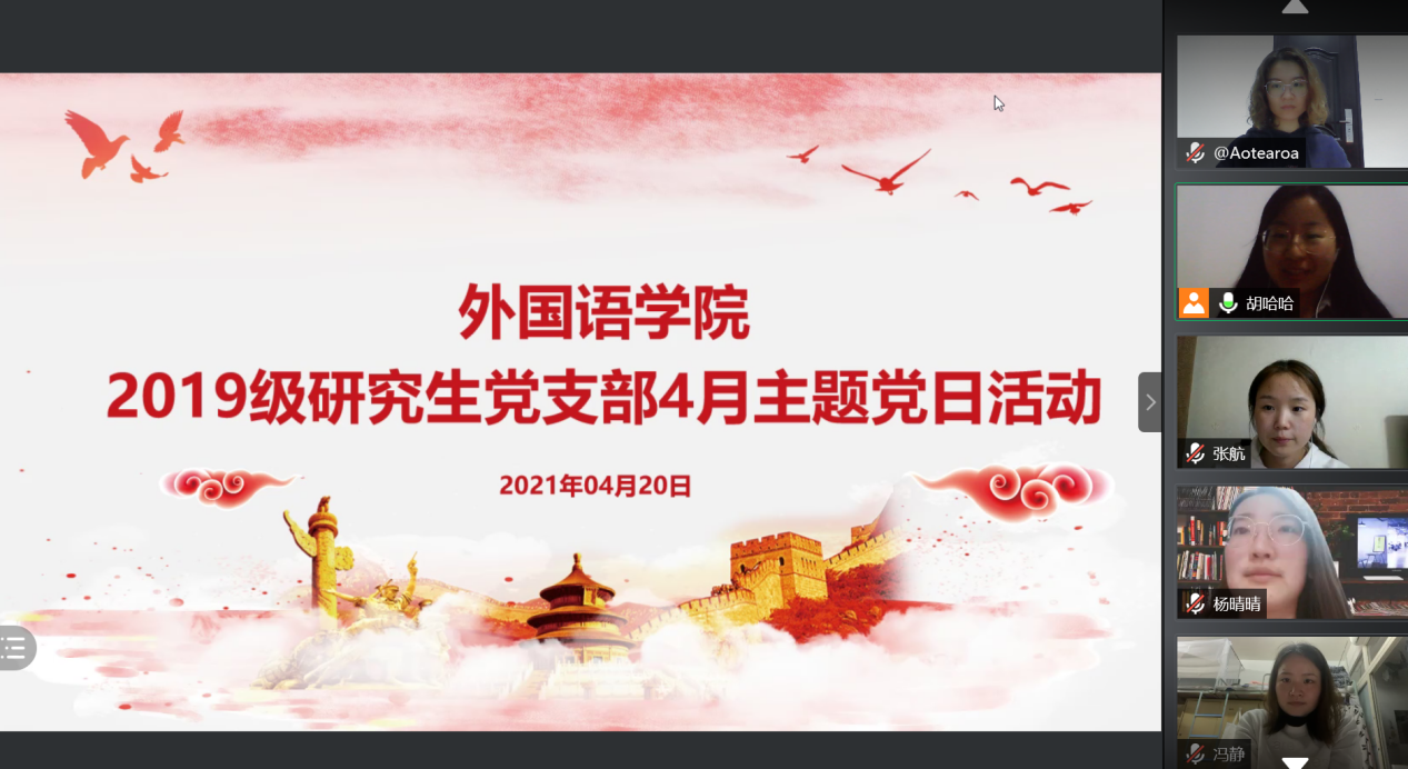 院网讯(通讯员 胡清华)4月20日晚8点,2019级研究生党支部在线上开展了“学史增信跟党走 百年荣光耀初心”的主题党日活动,本次主题党日活动由胡清华同志带领学习,支部全体成员积极参与、认真领会活动精神。