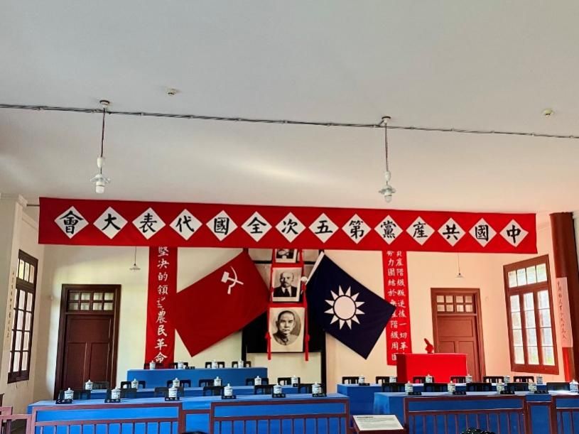 朴素的“中国共产党第五次全国代表大会”横幅悬挂在纪念馆内,摆设考究的标语条幅、桌椅板凳、党旗照片,生动再现了中共五大开幕会场的场景。大革命的失败,需要中国共产党对形势有清醒的认识并采取果断行动,全体党员期望这次大会能正确判断当前局势,回答大家最为关注的如何从危急中挽救革命的问题。此次会议选举产生了党的历史上第一个中央纪律检查机构——中央监察委员会,在党的建设史上具有重要意义,体现了中国共产党在不同历史时期的纪律建设理念、战略方针、主要成果。