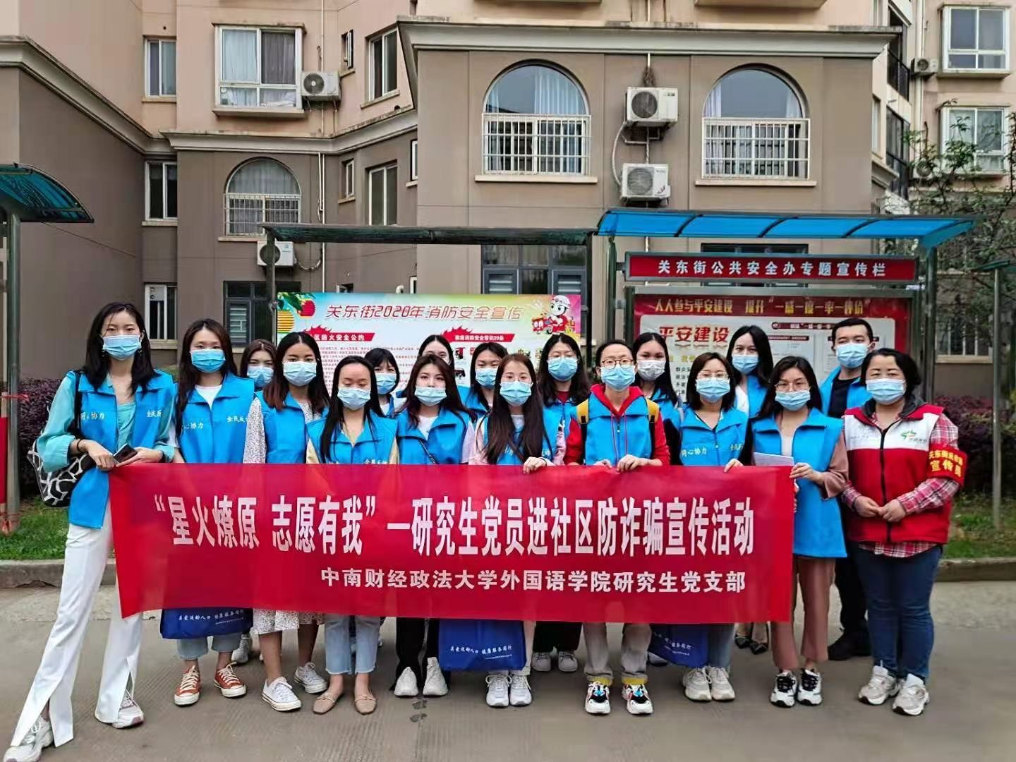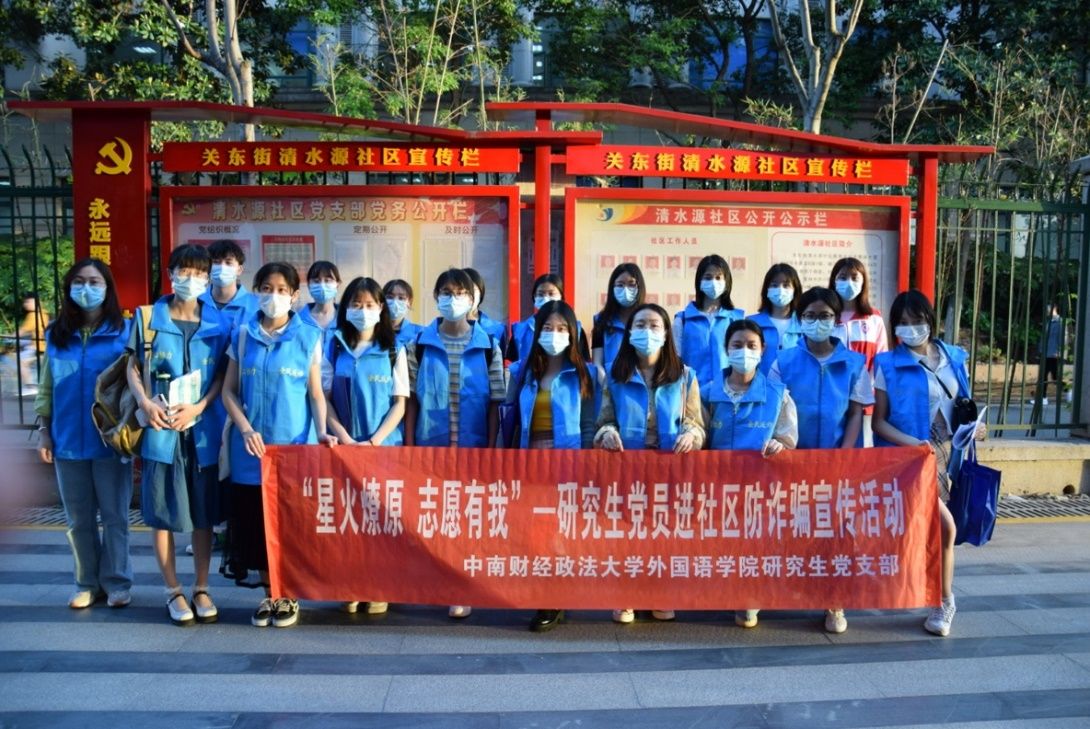 院网讯(通讯员:罗鑫)今年是中国共产党成立100周年,也是开启全面全面建设社会主义现代化国家新征程的第一年。为继承发扬党的优良传统和作风,做到“学史明理、学史增信、学史崇德、学史力行”,将党史学习教育的成效转化为实践成果,外国语学院于5月7日至8日期间组织开展“我为群众办实事——研究生党支部进社区防电信诈骗入户宣传活动”。本次活动的主题是“星火燎原,志愿有我”,旨在发动广大研究生党员和入党积极分子投身社会实践,践行“奉献、友爱、互助、进步”的志愿服务精神,以“星星之火”的奉献达到“可以燎原”的效果,通过进社区活动加强与人民群众的联系,更加全面地认识社会,同时增强自身的防诈骗意识。