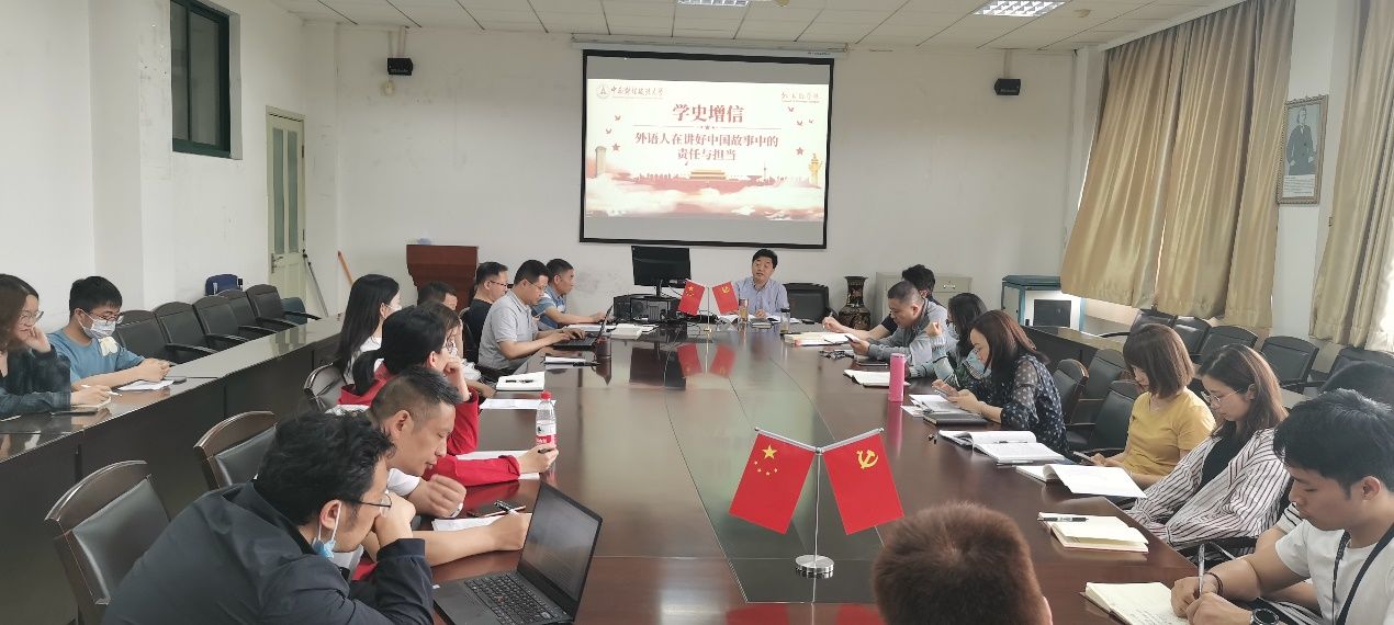 院网讯(通讯员 陈长军)为深入学习贯彻习近平总书记在党史学习教育动员大会上的重要讲话精神,按照学校党史学习教育工作组有关要求,5月25日下午,学院党委书记余启军教授在文波楼402会议室,以“学史增信—外语人在讲好中国故事中的责任与担当”为主题讲授专题党课,学院党政领导班子全体成员、师生党支部书记、行政党支部党员和学生代表出席会议。
