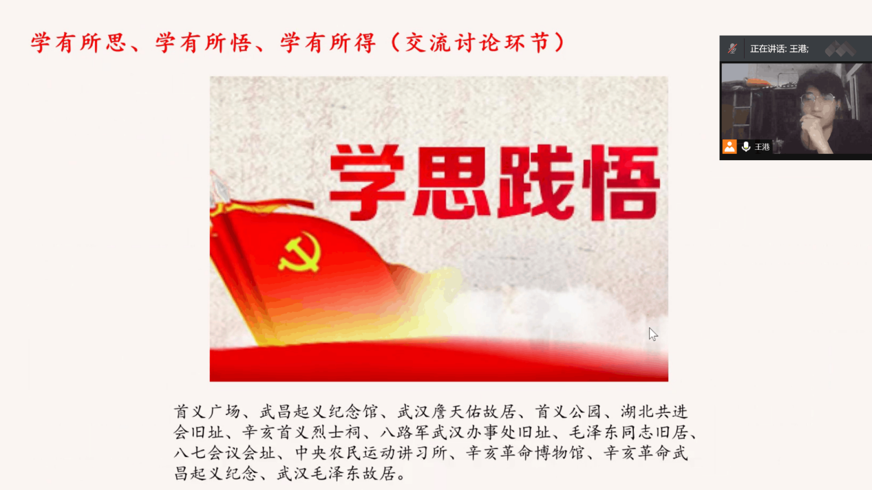 在交流讨论环节,盛锦涛同志通过查阅相关资料介绍了武汉地区主要的红色旅游资源,倡议大家有机会要一同参观学习。