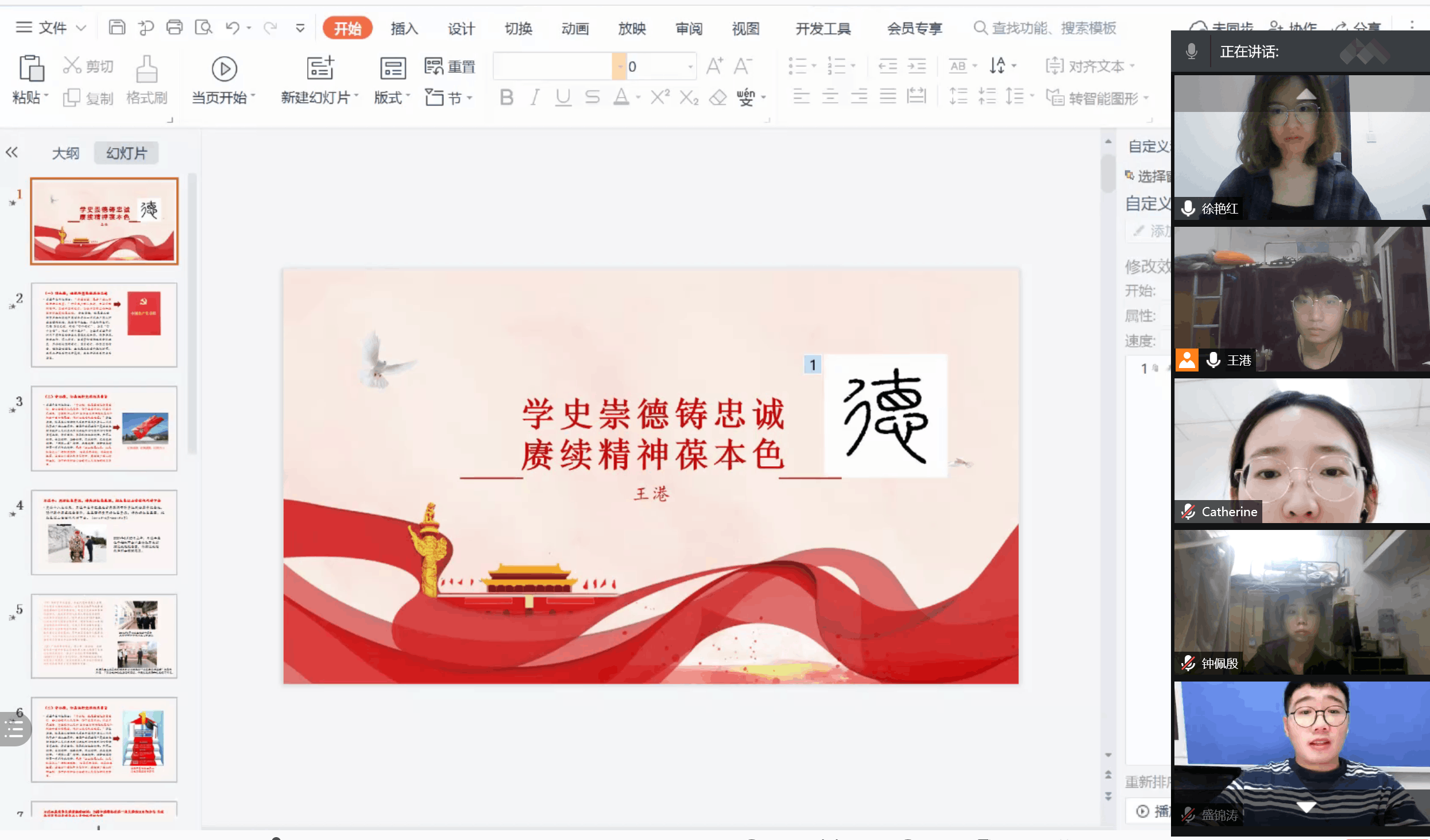 院网讯(通讯员:王港)2021年5月23日晚7点,外国语学院2018级、2019级研究生党支部联合在腾讯会议开展主题为“学史崇德铸忠诚,赓续精神葆本色”的5月主题党日活动。活动由2019级研究生党支部书记徐艳红主持,预备党员王港同志主讲,18、19级支部全体党员、预备党员、入党积极分子参加学习活动。