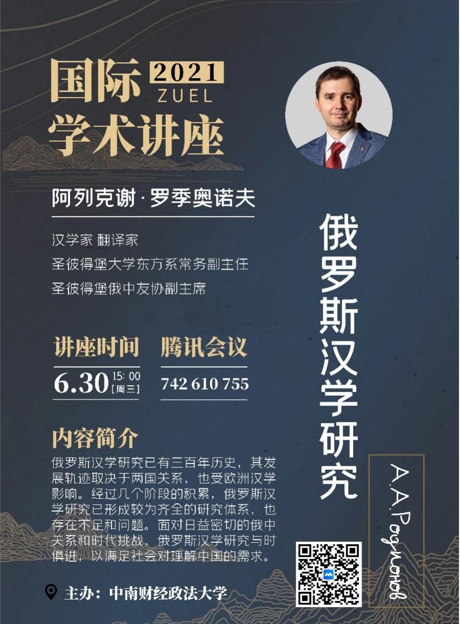 院网讯(通讯员 刘早)6月30日下午,由外国语学院主办的《俄罗斯汉学研究》国际学术讲座在线上进行。应俄语专业教研室邀请,俄罗斯知名汉学家、翻译家,圣彼得堡国立大学东方系常务副主任,圣彼得堡俄中友好协会副主席罗季奥诺夫(АлексейАнатольевичРодионов)为我校师生以及校外专家学者带来了一场信息量丰富,涵盖面广泛的讲座。讲座由朱红琼教授主持。