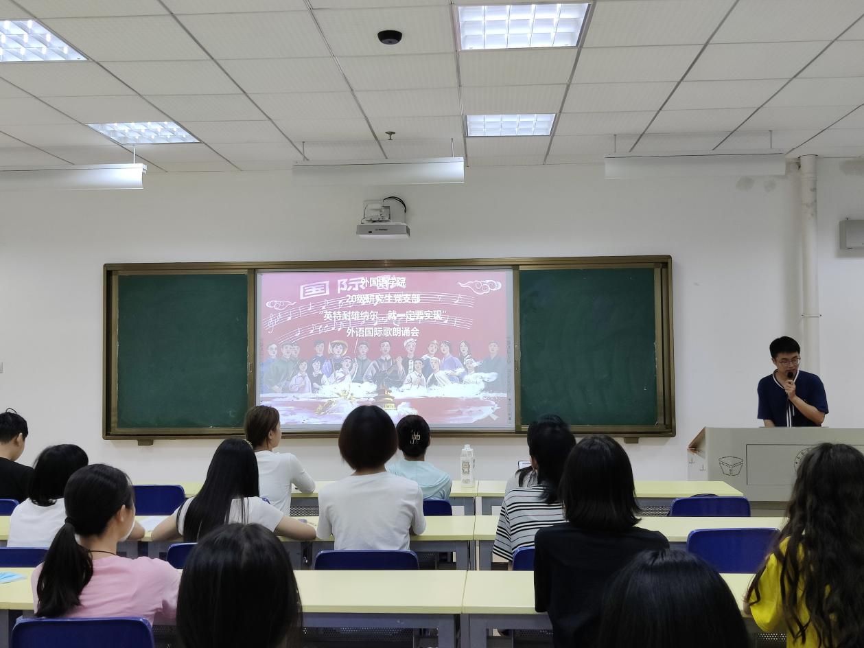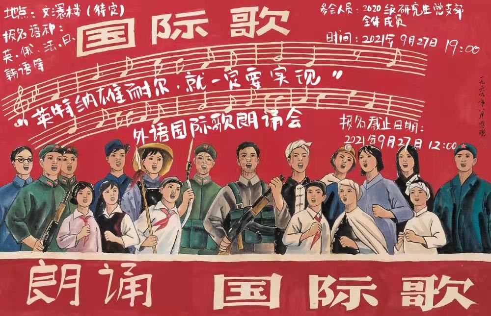院网讯(通讯员:卢冰雁 刘牧月)为庆祝中国共产党建党 100 周年,增强党对大学生的凝聚力和号召力,鼓励广大青年党员发出红色声音,重温历史经典,通过声音彰显青春活力,传递青春力量,学院2020级研究生党支部结合外语学科特点,举办了“英特纳雄耐尔,就一定要实现”外语国际歌朗诵会。活动于2021年9月27日19时在文澴楼515教室组织开展,2020级研究生支部全体党员和入党积极分子参加了本次朗诵会。