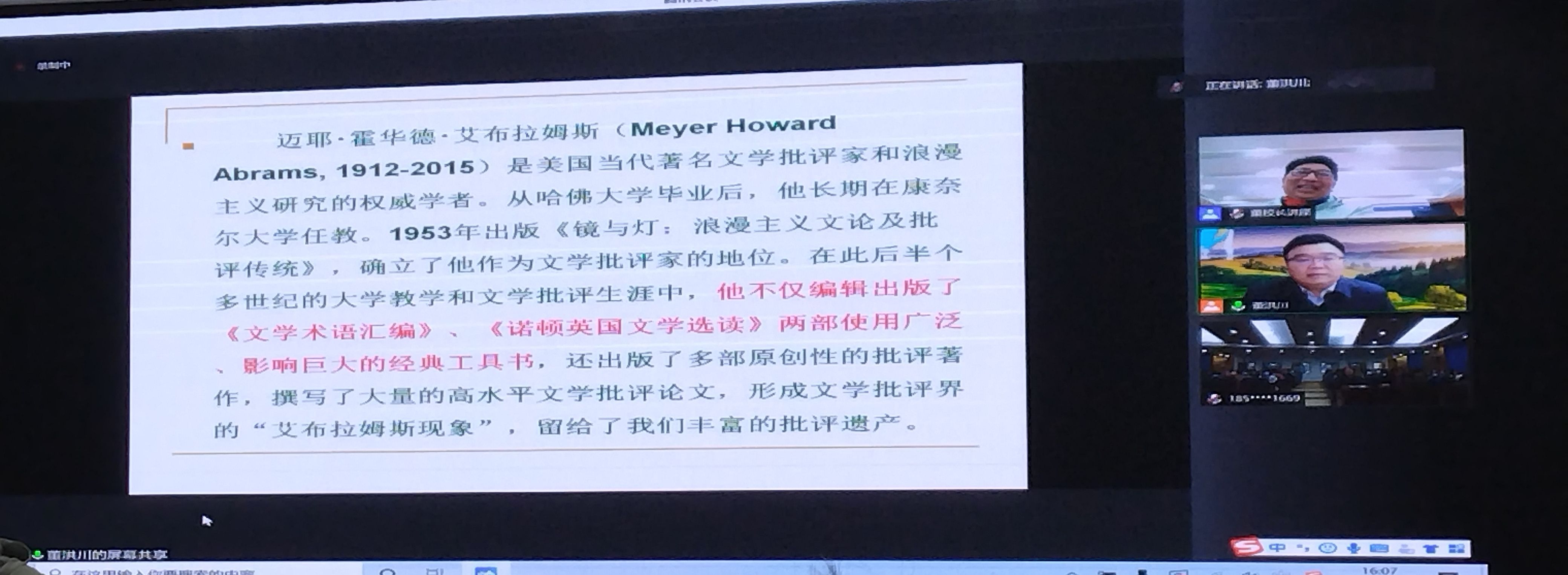 院网讯(通讯员:刘晓清、史雅芳)2021年10月21日下午4时,应米兰电竞·(中国区)外国语学院邀请,四川外国语大学校长、博士生导师、二级教授、国家社科基金评审专家、中国翻译协会副会长董洪川教授为我院教师、研究生带来一场题为“文学就是人学:M.H.艾布拉姆斯论人文主义批评”的线上学术讲座。本次讲座由外国语学院院长蔡圣勤教授主持,外国语学院袁奇副院长、谢群教授、英语语言文学专业研究生导师刘红卫教授、王娜教授、李晶教授等多位老师及我院21级翻译、日语、文学等方向的全体硕士研究生在文波楼外语学院同传会议室观看、参与了此次讲座。值得一提的是,董教授本来要亲自到我校来给师生做讲座,因疫情防控需要,本次讲座临时改为线上讲座线下互动,但仍然取得了非常好的效果。