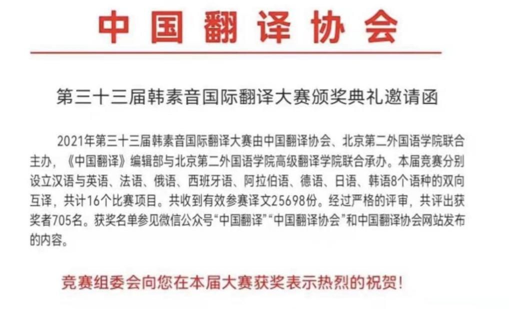 第三十三届韩素音国际翻译大赛于日前圆满结束并公布获奖名单,我院2020级通用笔译专业研究生雷珊荣获“英译汉”三等奖、2020级英语口译专业研究生刘牧月获得“英译汉”优秀奖。