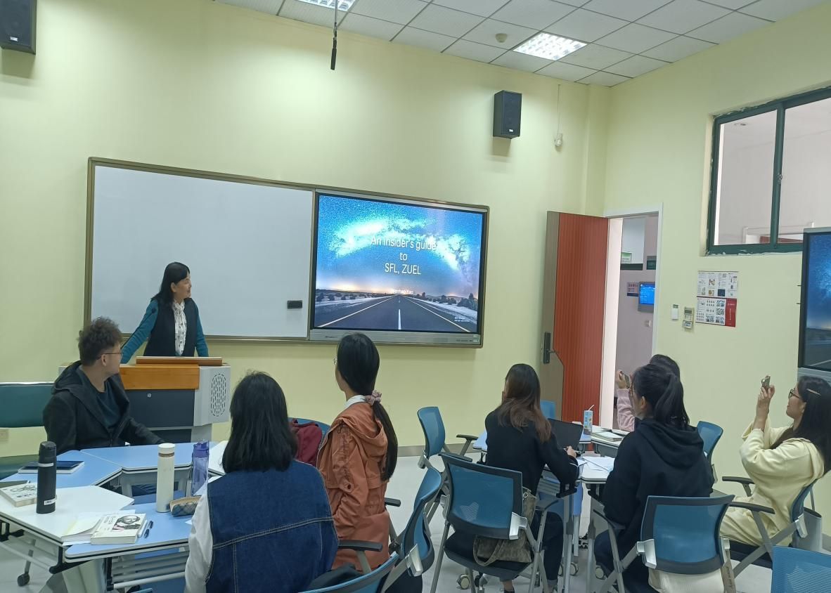 会议伊始,谢教授向同学们介绍了么文浩师兄的学习经历以及所取得的学术成果。么文浩师兄本硕阶段均就读于中南财经政法外国语学院,对学校充满感情。他以“An Insider’s Guide to SFL, ZUEL”为题,分别从个人经历、课堂学习、课外实践、课外活动、学习资源获取等方面向同学们分享了学习方法。