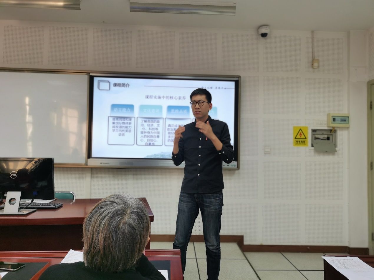 八号参赛选手李中正简述了《国际视角解读中国》的教学目的和教学内容,重点介绍了在中国的电影市场爱国题材电影越来越受欢迎的情况,并以诙谐幽默的语言进行了简短有效的课堂互动和课堂讨论。